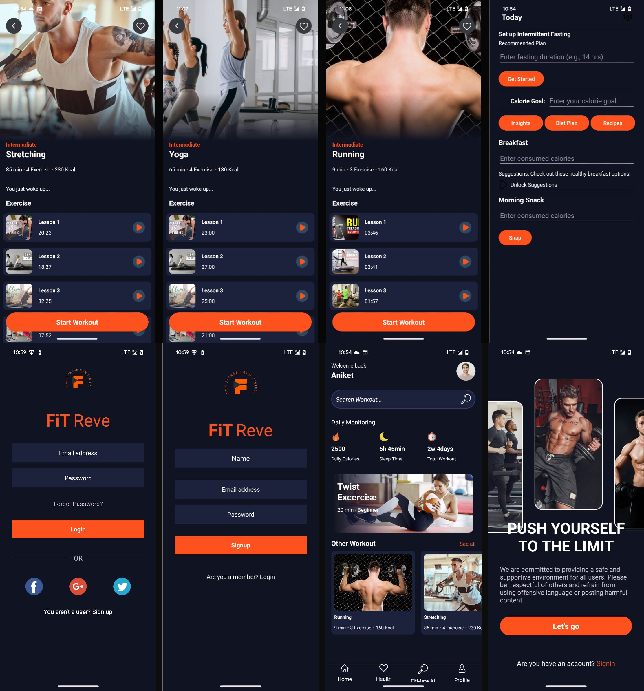 FitReve is a comprehensive fitness application designed to revolutionize the way users approach health and wellness. With a seamless integration of cutting-edge technologies, including Generative AI, Firebase, and body sensor-based tracking, FitReve provides personalized meal and workout plans, tracks daily activities, and offers a complete fitness management solution.